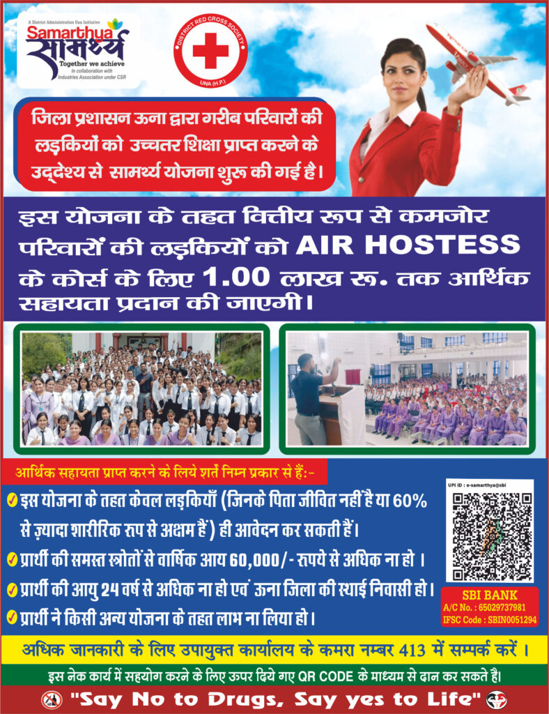 ऊना जिला प्रशासन ने युवा और महिला कल्याण के लिए समर्पित पहल ‘सामर्थ्य’ के दायरे को और अधिक विस्तृत कर दिया है। अब इस योजना के अंतर्गत लड़कियों को एयर होस्टेस कोर्स के लिए भी आर्थिक सहायता प्रदान करने का प्रावधान किया गया है।