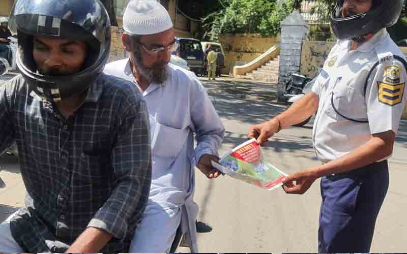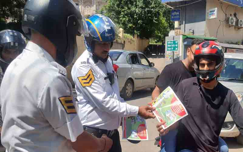 ट्रैफिक पुलिस के द्वारा चौगान मैदान के साथ मुख्य रोड पर दो पहिया वाहन चालकों को हेलमेट के महत्व के बारे में बताया गया। हेड कांस्टेबल दिनेश ने बताया कि दो पहिया वाहन चलने वाले चालक और पीछे बैठने वाले व्यक्ति को बेहतर क्वालिटी में आई एसआईमार्क का हेलमेट ही पहनना चाहिए।