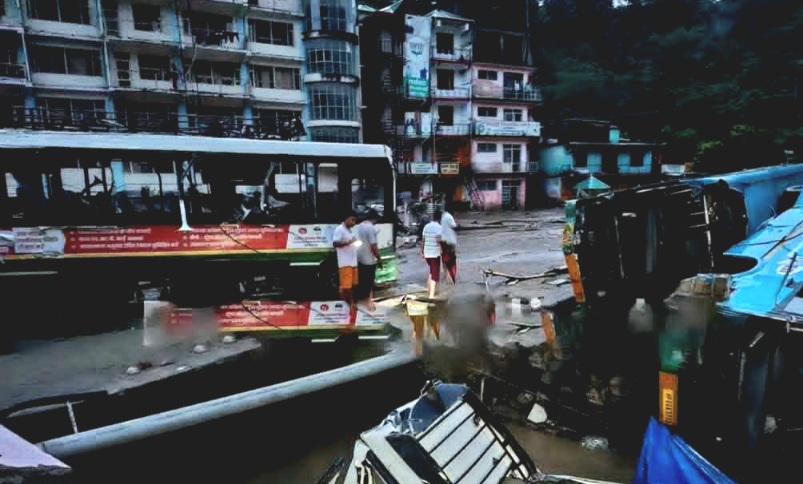 HRTC की 20 से ज्यादा बसें पानी में डूब गईं, साथ ही कई गाड़ियां, दुकानें और घर भी क्षतिग्रस्त हुए।