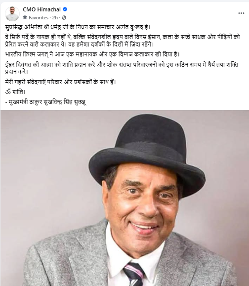 मुख्यमंत्री सुक्खू ने अपने संदेश में कहा कि धर्मेंद्र का जीवन, उनका सादापन और अभिनय के प्रति समर्पण पीढ़ियों को प्रेरित करता रहेगा। उन्होंने कहा कि धर्मेंद्र सिर्फ फिल्म स्टार नहीं थे, बल्कि मानवीय मूल्यों से भरे एक सच्चे इंसान थे, जिन्हें जनता ने दिल से अपनाया।