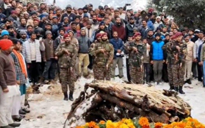 जिला सिरमौर के शिलाई विधानसभा क्षेत्र से भारतीय सेना के जवान कपिल का शनिवार को पैतृक गांव पटना में पूरे सैन्य सम्मान के साथ अंतिम संस्कार किया गया। छोटे भाइयों नितिन और रोहित ने भाई को मुखाग्नि दी, जबकि नम आंखों से ग्रामीणों और पूर्व सैनिकों ने वीर सपूत को अंतिम विदाई दी।