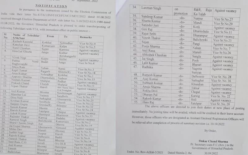 हिमाचल प्रदेश में विधानसभा चुनाव से पहले ही प्रदेश के तकरीबन 55 तहसीलदारों के ट्रांसफर कर दिए गए हैं। हिमाचल प्रदेश सरकार ने निर्वाचन आयोग के निर्देशों पर इन तहसीलदारों के ट्रांसफर किए हैं तथा इस संबंध में प्रधान सचिव राजस्व ओंकार चंद शर्मा की ओर से आदेश जारी करते हुए उक्त तहसीलदारों को तैनाती के नए स्थान पर ज्वाइनिंग देने को कहा गया है।
