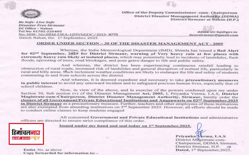 School Closure Sirmaur / 2 सितंबर को सिरमौर जिले में सभी स्कूल रहेंगे बंद September 1, 2025 हिमांचलनाउ डेस्क नाहन