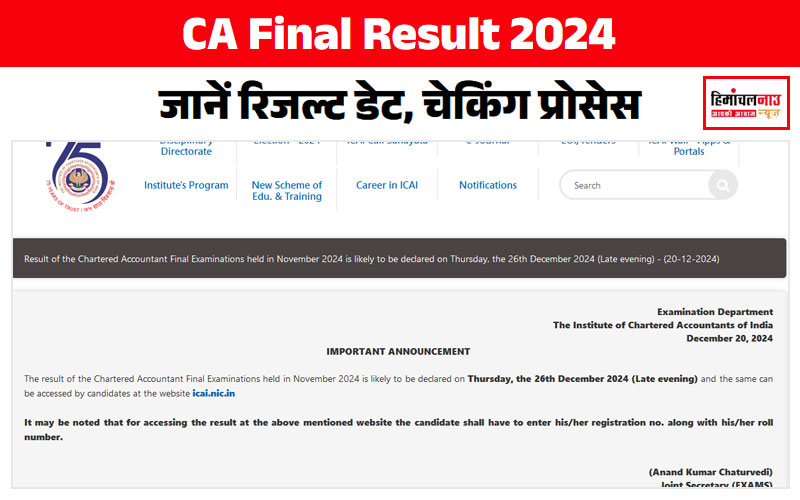 ICAI के अनुसार, नवंबर 2024 में आयोजित चार्टर्ड अकाउंटेंट फाइनल परीक्षा का परिणाम 26 दिसंबर 2024 को घोषित किया जाएगा।