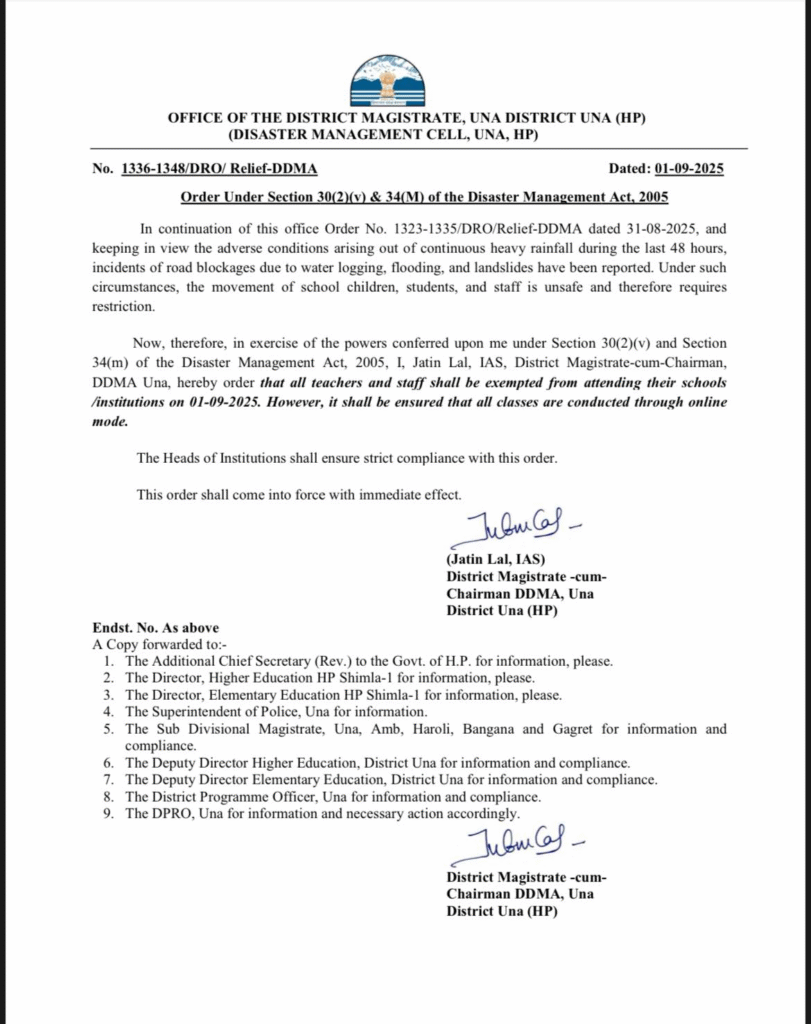 2 सितंबर को जिला ऊना में सभी सरकारी और निजी शिक्षण संस्थान, कॉलेज, आईटीआई, व्यावसायिक प्रशिक्षण केंद्र और आंगनबाड़ी केंद्र बंद रहेंगे। हालांकि, आवासीय संस्थान इससे बाहर रखे गए हैं।