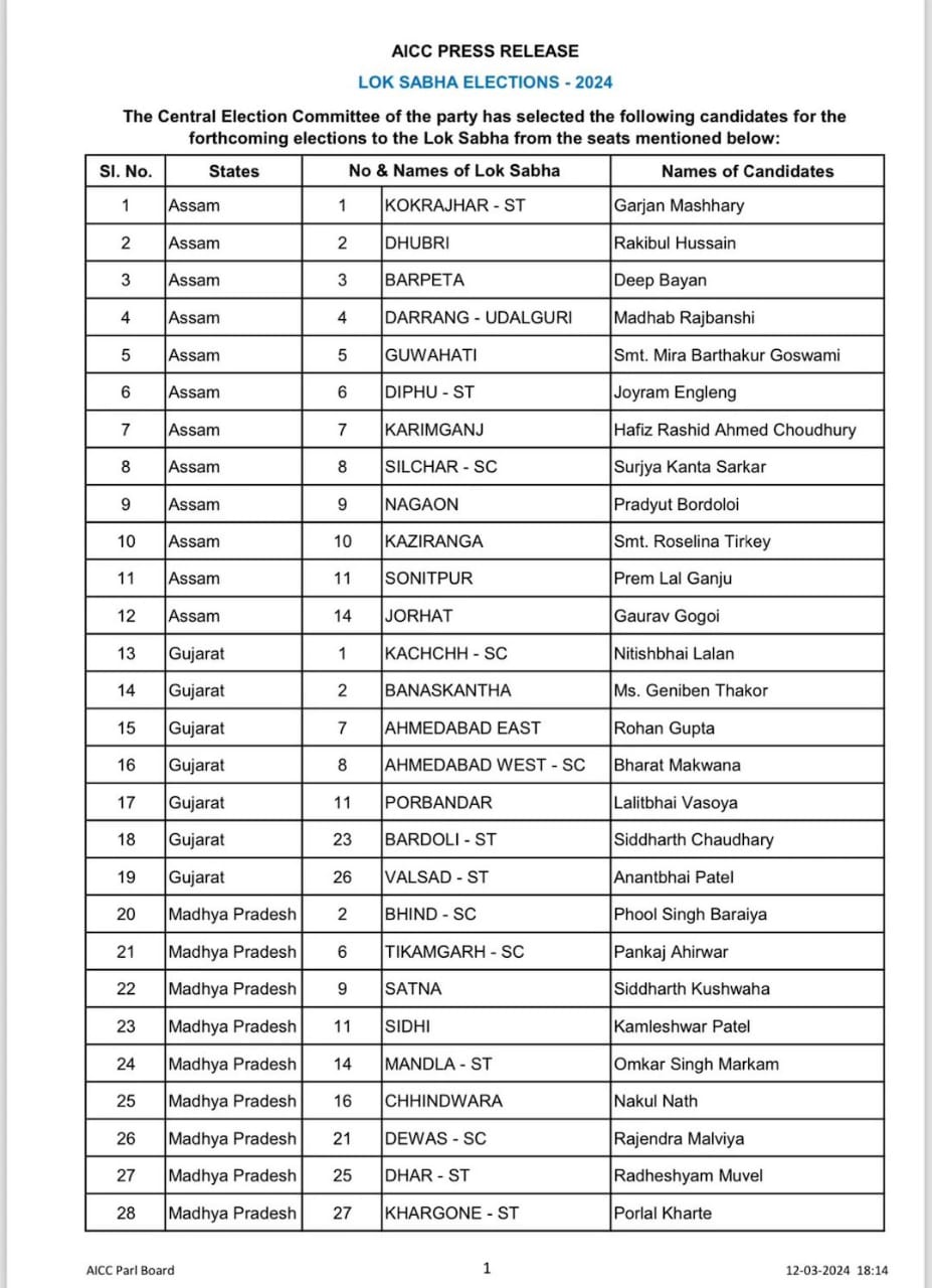 इसके अलावा जोरहाट से गौरव गोगोई, सिलचर से सुरज्या खान, जालौर से अशोक गहलोत के बेटे वैभव गहलोत को अपना प्रत्याशी बनाया है। कांग्रेस ने इस लिस्ट में 7 जनरल, 13 ओबीसी,10 एससी, 9 एसटी और एक मुस्लिम उम्मीदवारों को टिकट दिया है।