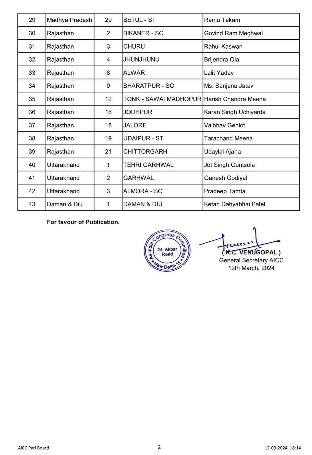 कांग्रेस ने अपने लोकसभा प्रत्याशियों की दूसरी लिस्ट जारी कर दी है। लिस्ट में 43 उम्मीदवारों के नाम का ऐलान किया गया है। इस लिस्ट में कांग्रेस ने लोकसभा चुनाव के लिए 43 सीटों पर उम्मीदवारों के नामों का ऐलान कर दिया है।