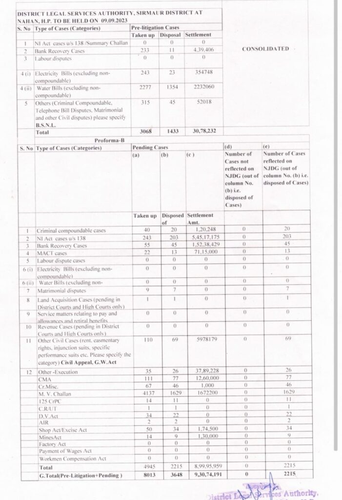 जिला विधिक सेवा प्राधिकरण सिरमौर की सचिव माधवी सिंह ने बताया कि लोक अदालतों में पूर्व मुकदमेबाजी और लंबित केस के 8013 मामले लोक अदालतों में सुनवाई के लिए पहुंचे, जिसमें प्री-लिटिगेशन के 3068 व 4945 लंबित मामले शामिल रहे।