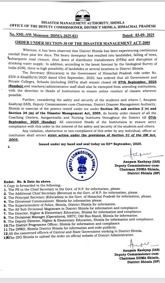 डिप्टी कमिश्नर शिमला अनुपम कश्यप (आईएएस) ने आदेश जारी करते हुए कहा कि 7 सितंबर तक सभी सरकारी और निजी स्कूल, कॉलेज, आंगनवाड़ी केंद्र और कोचिंग संस्थान बंद रहेंगे। इस दौरान केवल ऑनलाइन कक्षाएं संचालित होंगी।