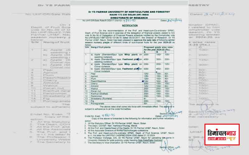 डॉ. वाईएस परमार कृषि विश्वविद्यालय, नौनी ने शीतकालीन नर्सरी पौधों की बिक्री के लिए नई दरें मंजूर कर दी हैं। ये दरें वित्तीय वर्ष 2024-25 से प्रभावी होंगी। सेब, नाशपाती, आलूबुखारा, चेरी, आड़ू, प्लम, और अखरोट समेत कई फलों के पौधों की सरकारी कीमतों को संशोधित कर घोषित किया गया है।