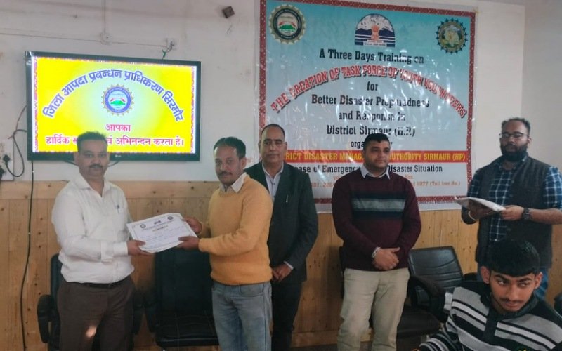 जिला आपदा प्रबंधन प्राधिकरण, सिरमौर द्वारा विकासखंड पच्छाद की सात पंचायतों के 73 युवा स्वयंसेवकों की टास्क फोर्स के निर्माण हेतु आपदा प्रबंधन के तीन दिवसीय प्रशिक्षण कार्यक्रम का आज खंड विकास कार्यालय पच्छाद स्थित सराहा में उपमंडल अधिकारी (नागरिक) पच्छाद, डॉ संजीव कुमार धीमान ने सभी सफल युवा स्वयंसेवको को प्रमाण पत्र देकर सम्मानित किया।