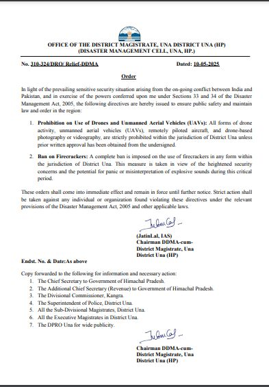 भारत-पाकिस्तान के बीच जारी तनावपूर्ण हालातों के मद्देनजर ऊना जिला प्रशासन ने ड्रोन उड़ाने और पटाखे चलाने पर पूर्ण प्रतिबंध लगाने के आदेश जारी किए हैं। जिला दंडाधिकारी एवं जिला आपदा प्रबंधन प्राधिकरण के अध्यक्ष जतिन लाल ने आपदा प्रबंधन अधिनियम 2005 की धारा 33 और 34 के अंतर्गत यह आदेश जारी किए हैं।