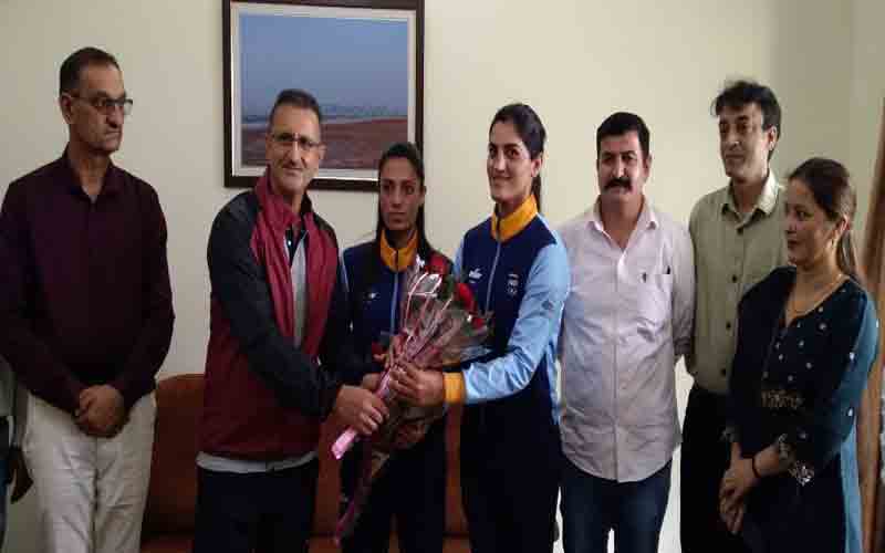 भारतीय महिला कबडडी टीम की कैप्टन रितु नेगी और पुष्पा राणा को डीसी सुमित खिमटा ने शॉल-टोपी भेंट कर किया सम्मानित