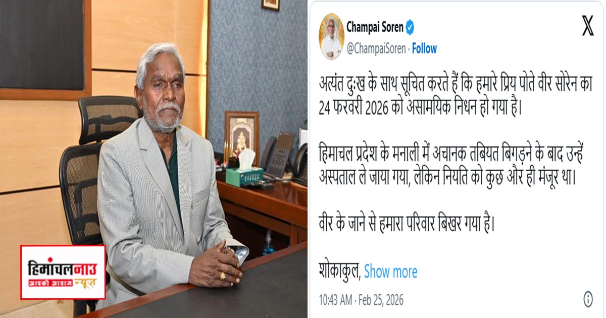 पूर्व मुख्यमंत्री चंपई सोरेन ने सोशल मीडिया पर अपने पोते के निधन की पुष्टि की। घटना की जानकारी मिलते ही परिवार दिल्ली के लिए रवाना हुआ, जहां से वे मनाली पहुंचेंगे। झारखंड में उनके पैतृक गांव में भी शोक का माहौल है।