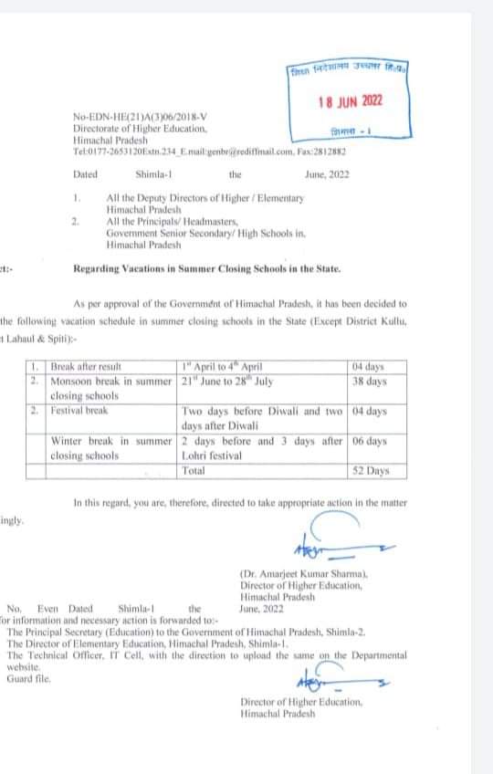 इस संबंध में उच्च शिक्षा निदेशालय की ओर से जारी अधिसूचना के अनुसार कुल्लू व लाहौल-स्पीति जिला को छोड़कर सभी ग्रीष्मकालीन अवकाश वाले स्कूलों में लागू रहेगा। 21 जून से 28 जुलाई तक ग्रीष्मकालीन स्कूलों में 38 दिनों की बरसात की छुट्टियां रहेंगी।