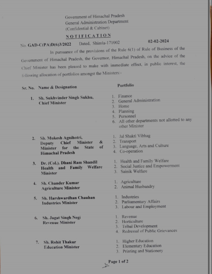 सुक्खू कैबिनेट में फेरबदल: 5 मंत्रियों को वर्तमान विभाग के साथ दी अन्य विभाग की जिम्मेदारी