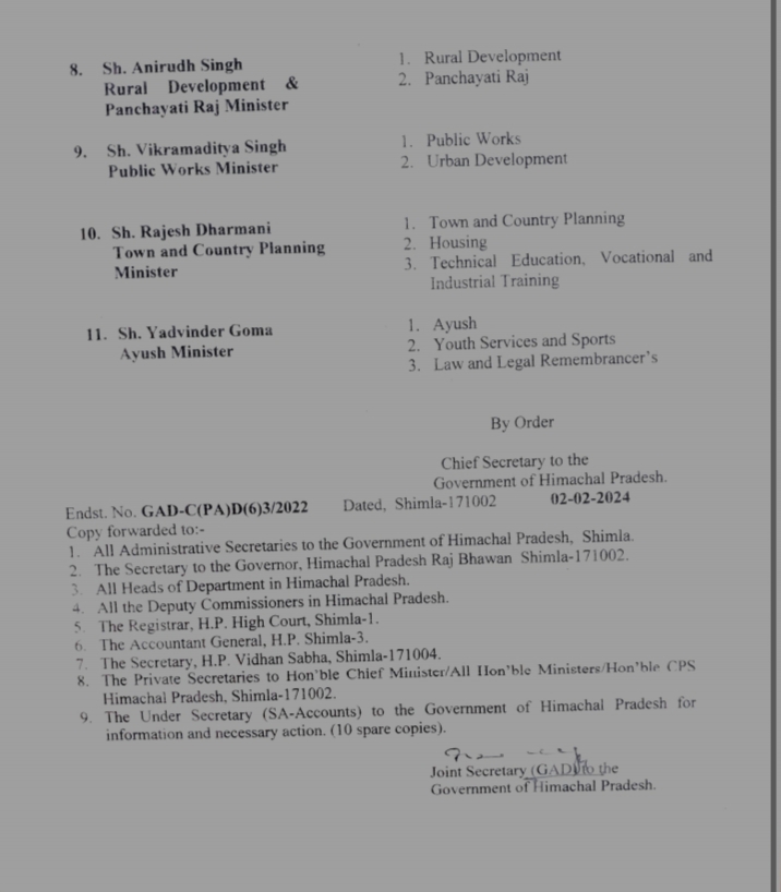 इसके अलावा यादविंदर गोमा को खेल व आयुष के साथ लॉ डिपार्टमेंट की जिम्मेदारी दी है। वहीं लोक निर्माण मंत्री विक्रमादित्य सिंह को शहरी विकास विभाग दिया गया है।इसके अलावा स्वास्थ्य मंत्री धनी राम शांडिल से श्रम विभाग वापस लिया है।