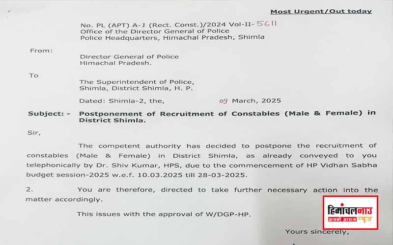 Shimla Police Constable Recruitment Postponed /शिमला में पुलिस कांस्टेबल भर्ती स्थगित , बजट सत्र के चलते लिया गया फैसला March 9, 2025 हिमांचलनाउ डेस्क नाहन