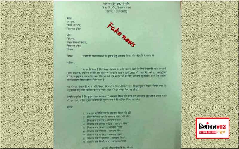 सिरमौर में पंचायत चुनाव के आरक्षण रोस्टर की खबर फर्जी, प्रशासन का खंडन September 17, 2025 हिमांचलनाउ डेस्क नाहन