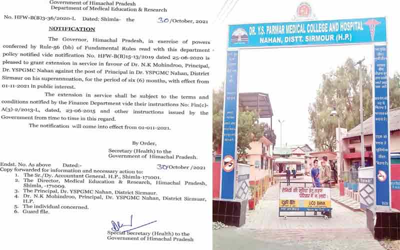 सेवानिवृत्त हो चुके नाहन मेडिकल कॉलेज के प्रिंसिपल को 6 महीने की एक्सटेंशन दिए जाने के बाद एक बार फिर सरकार पर सवाल खड़े हो गए हैं। डॉक्टर एनके महेंद्रू को एक्सटेंशन दिए जाने के आदेश सचिव स्वास्थ्य विभाग द्वारा किए दर्शाए गए हैं। बता दें कि डॉक्टर महेंद्रू 30 अक्टूबर 2021 को सेवानिवृत्त हो चुके हैं। हैरानी की बात तो यह है कि डॉक्टर महेंद्रू 65 की उम्र पार कर चुके हैं बावजूद इसके उन्हें 6 महीने की एक्सटेंशन दी गई है।