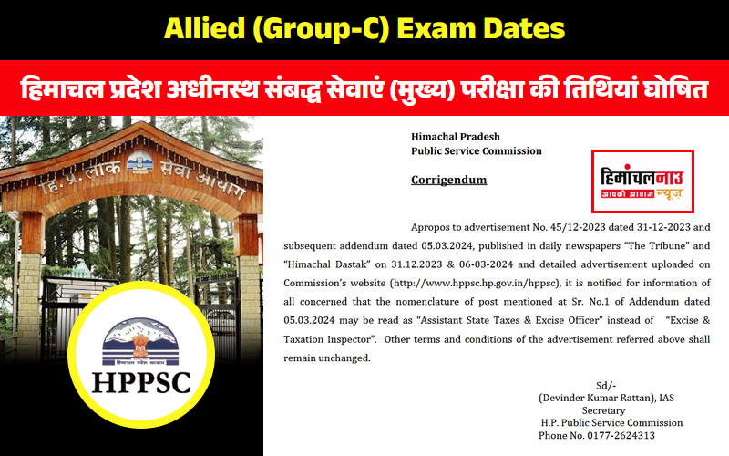 Allied (Group-C) Exam Dates / हिमाचल प्रदेश अधीनस्थ संबद्ध सेवाएं (मुख्य) परीक्षा की तिथियां घोषित January 6, 2025 हिमाचलनाउ डेस्क