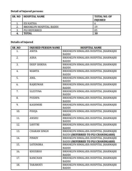 घायल 32 कामगारों को ईएसआई, बद्दी अस्पताल व ब्रुकलिन हॉस्पिटल में भर्ती करवाया गया है। जिसमें से 5 गम्भीर घायलों को पीजीआई रेफर किया गया है। हादसे के बाद डीसी सोलन, एसपी बद्दी, एसडीएम नालागढ़ समेत कई अधिकारी मौके पर पहुंच गए।
