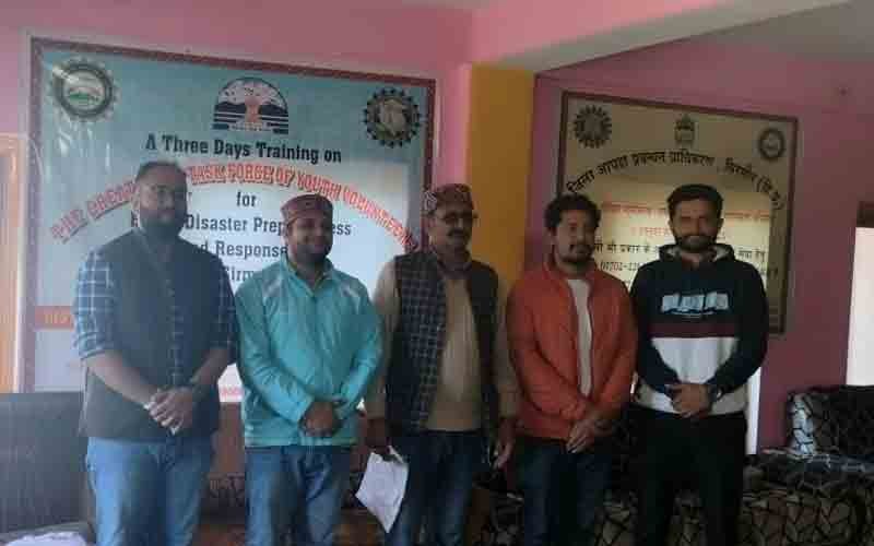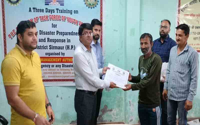 जिला आपदा प्रबंधन प्राधिकरण, सिरमौर द्वारा विकासखंड संगडाह के अंतर्गत हरिपुरधार की आठ पंचायतों के 80 युवा स्वयंसेवकों की टास्क फोर्स के गठन हेतु आपदा प्रबंधन के तीन दिवसीय प्रशिक्षण कार्यक्रम का समापन हुआ। मां भग्यानी मंदिर परिसर में खंड विकास कार्यालय संगडाह के प्रतिनिधि एवं कार्यक्रम के मुख्य अतिथि मदन राणा ने सभी सफल युवा स्वयंसेवको को प्रमाण पत्र देकर सम्मानित किया।