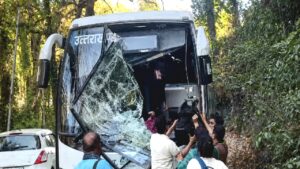खजुरना पुल पर बस-ट्रक की जोरदार भिड़ंत, शीशे तोड़कर निकाले गए यात्री