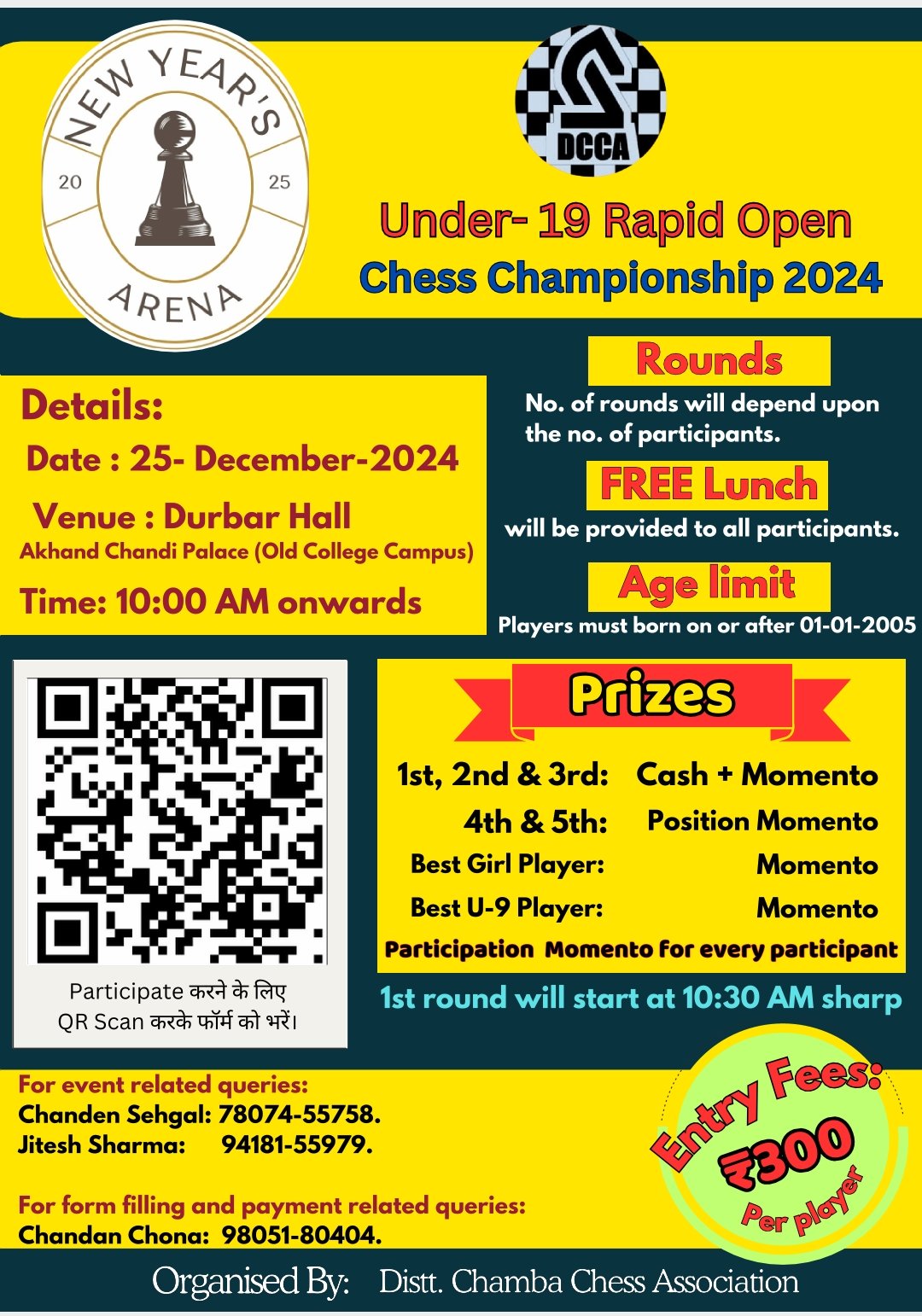 जिला चंबा शतरंज एसोसिएशन 25 दिसंबर को अखंड चंडी पैलेस स्थित दरबार हॉल में “न्यू ईयर एरीना U-19 रैपिड ओपन शतरंज चैंपियनशिप” का आयोजन कर रही है। इस आयोजन का उद्देश्य युवा शतरंज खिलाड़ियों को अपनी प्रतिभा प्रदर्शित करने और प्रतिस्पर्धा के माध्यम से अपने कौशल को निखारने का अवसर प्रदान करना है।