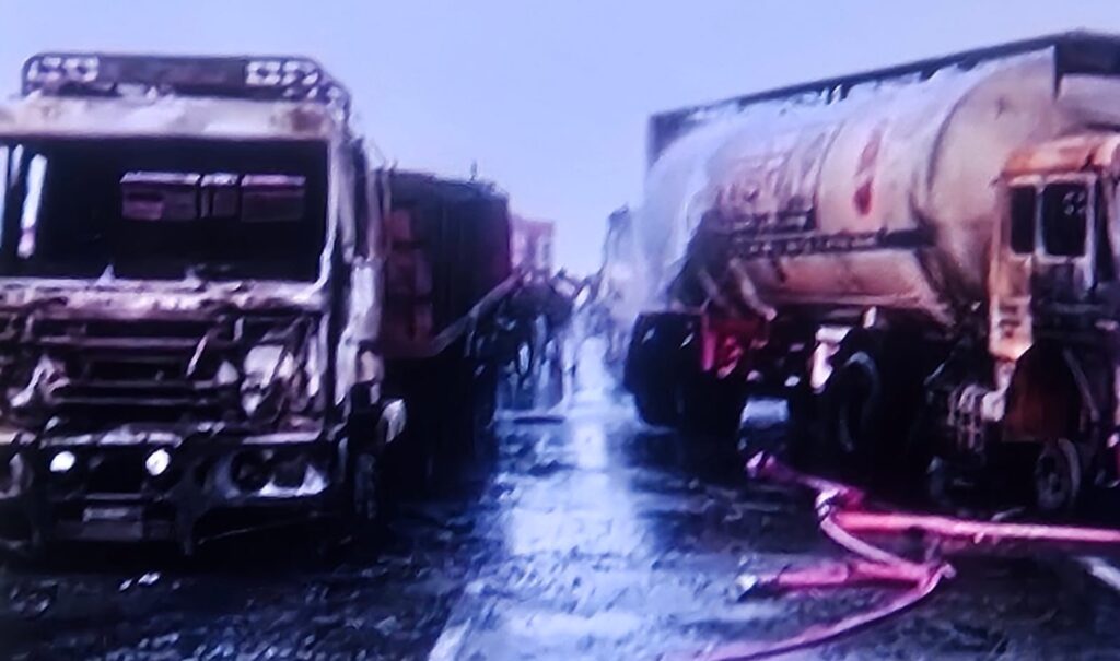 दूसरी ओर, जिला कलेक्टर जितेंद्र सोनी ने हादसे में पांच मौतों की पुष्टि की है और बताया कि 29 ट्रक और 2 बसें भी जलकर खाक हो गई हैं। चश्मदीदों के मुताबिक, हादसे में कई लोगों की मौत हुई है और कुछ घायल गंभीर स्थिति में हैं। एक प्रत्यक्षदर्शी ने कहा कि उसने एक जलते हुए ट्रक में दो लोगों के कंकाल देखे हैं।