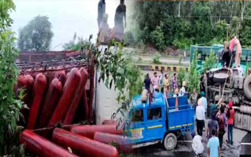 ऑक्सीजन सिलेंडर से भरा कैंटर पलटा, लगी आग चालक जख्मी